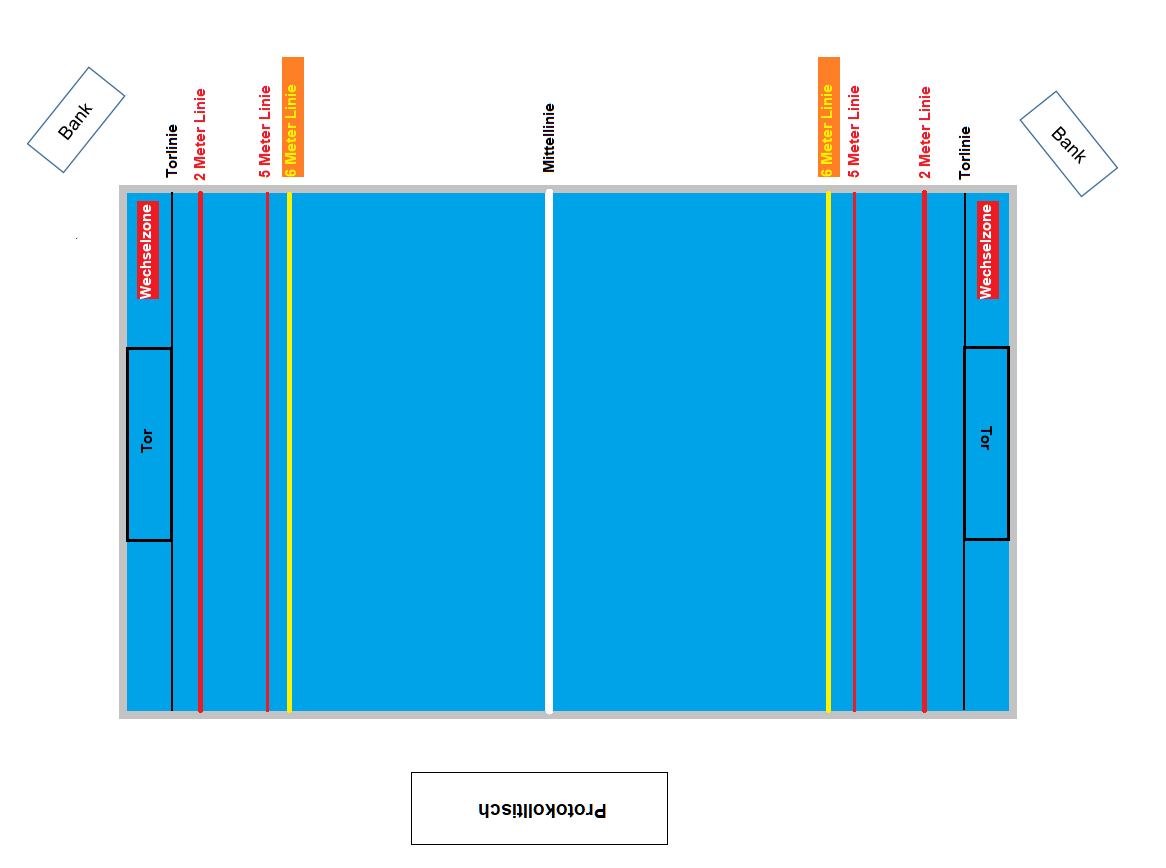 - d) rot: 5 m (Strafwurfpunkt)